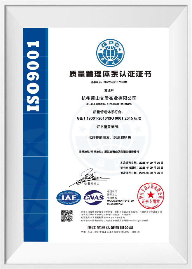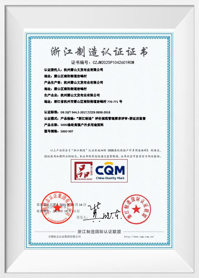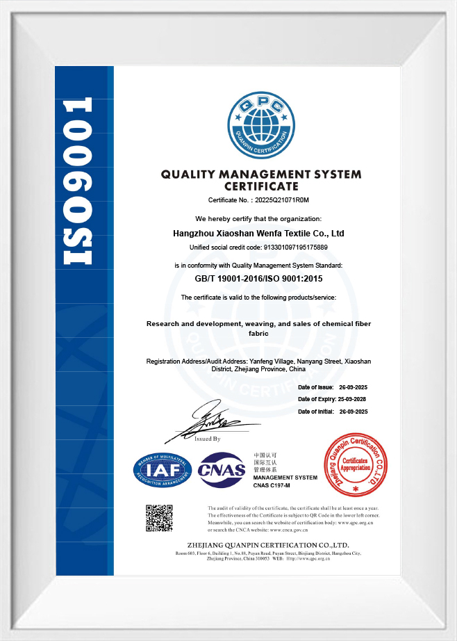 Wenfa Textile, ISO sertifikalıdır ve REACH, GRS ve OBP gibi küresel standartları karşılayarak kumaşlarının sıkı kalite ve sürdürülebilirlik gerekliliklerini karşılamasını sağlar. Kaliteye ve yeniliğe olan bağlılıkları, onları bagaj, dış mekan malzemeleri ve çocuk ürünleri de dahil olmak üzere çeşitli sektörlerdeki işletmeler için tercih edilen bir seçenek haline getiriyor.